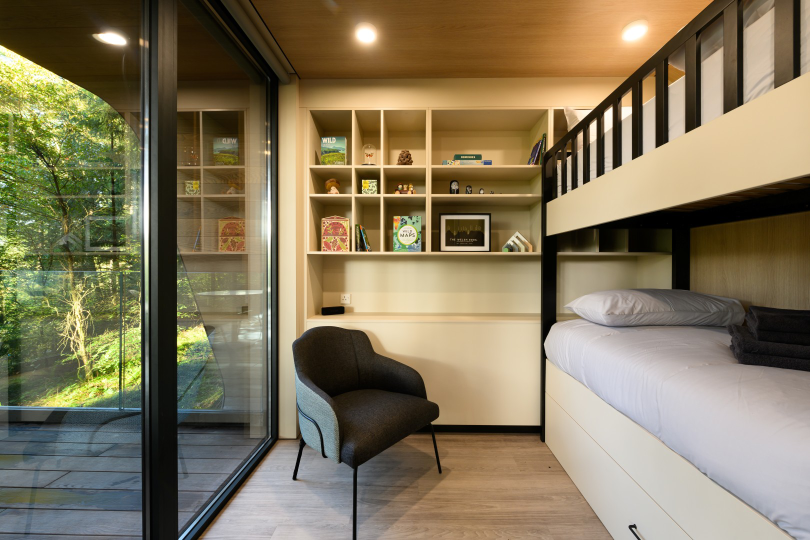 Inside, the Lodge blends comfort and style seamlessly. A fireplace warms the spacious living area, while a gourmet kitchen, spa-inspired bathrooms, and plush bedding ensure total relaxation. Reclaimed wood and stone add to the serene, earthy ambiance.